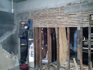 Simon removing the plaster and lathe on the wall between the library and foyer.